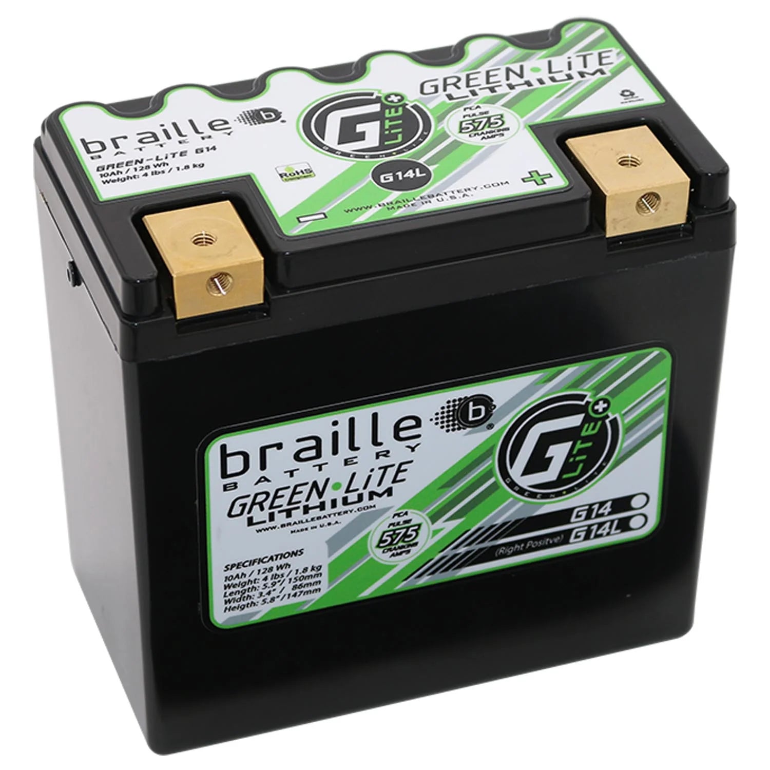 Our GreenLite G14LS extra capacity model, is the lithium upgrade for our very popular B14115 lightweight AGM battery (ETX14) and at only 4 pounds, is just a 1/3rd of the weight and offers more power and capacity, lasting up to 5 times longer than lead! (For a 'Left Positive' version, see our G14S).