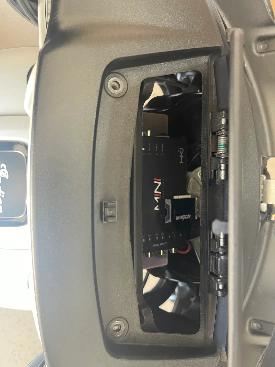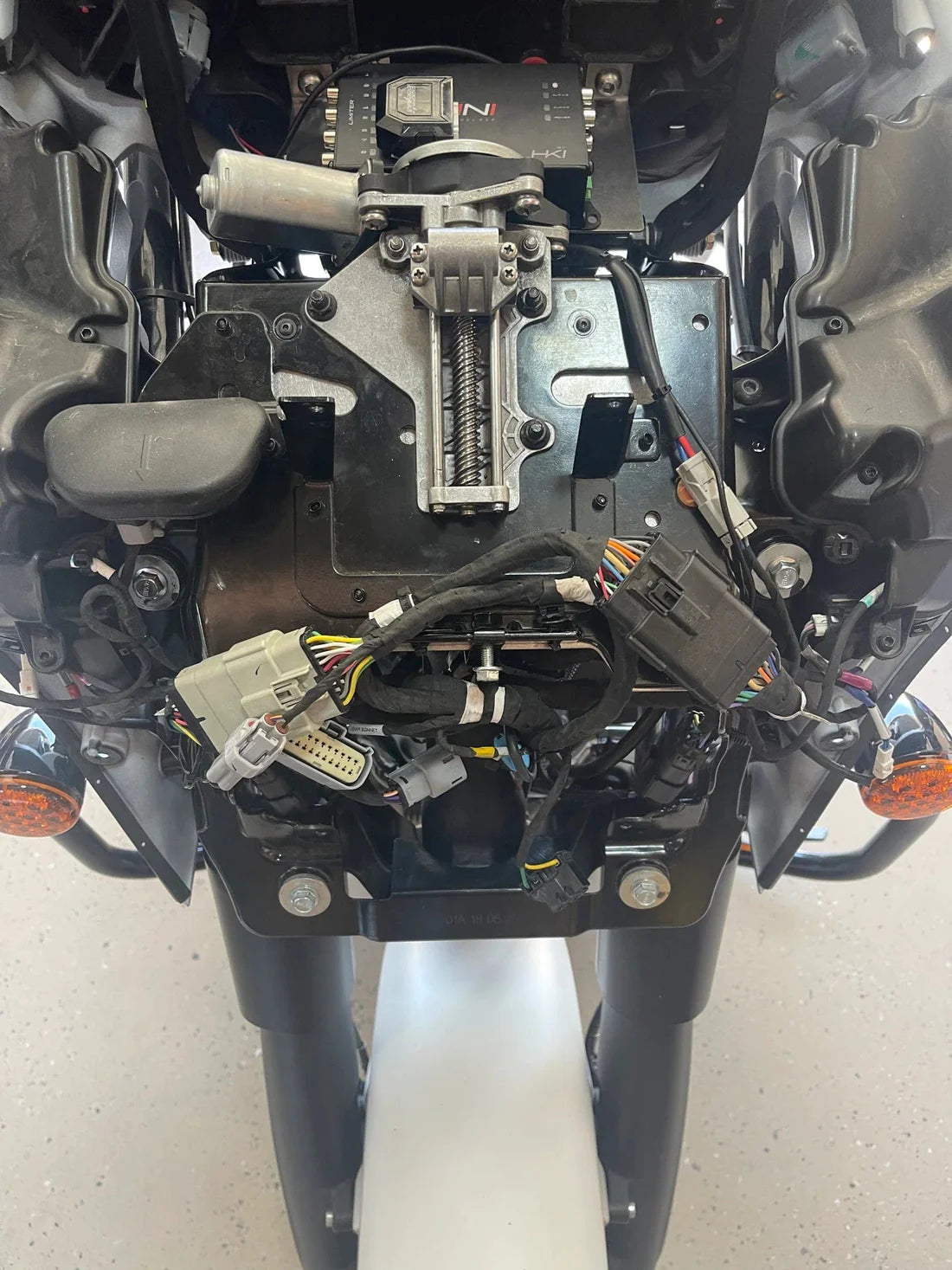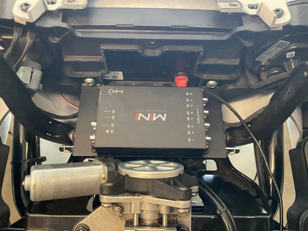 Custom-designed DSP mounting plate allows you to install a DSP behind the OEM ride command screen below the upper dash storage compartment in the fairing. This mounting plate was also designed to fit the Rockford DSR-1 & HKI mini DSP.