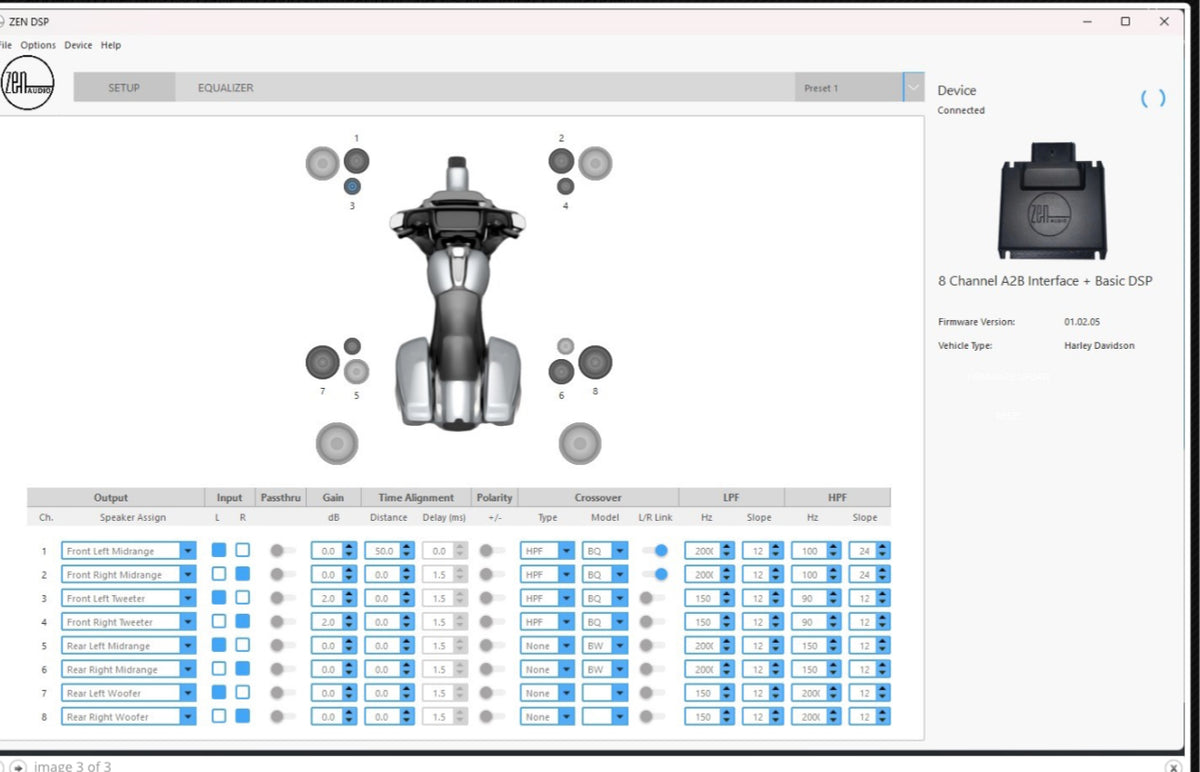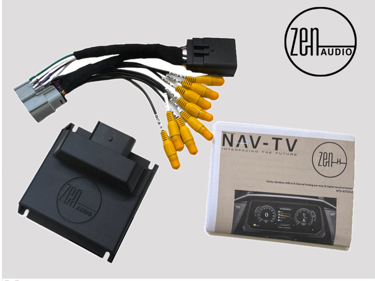 NAV-TV’s ZEN-H pro processor seamlessly allows aftermarket amplifiers to be added to the factory Harley-Davidson headunit via its low level (8 channel) analog RCAs @5V RMS. This plug & play kit integrates with various OEM data networks to retain chimes, volume control, fader/balance, and EQ Presets (for true OEM integration.)